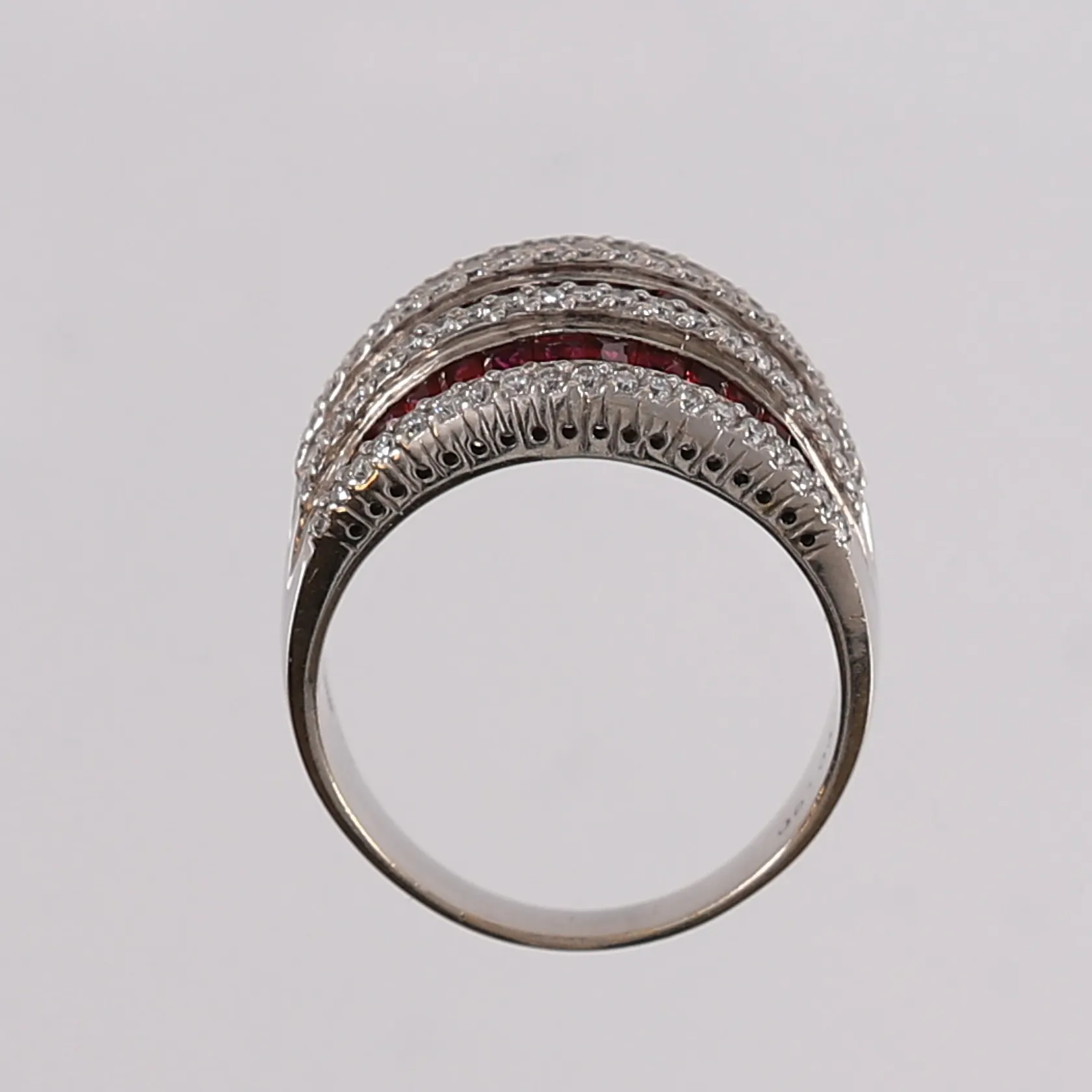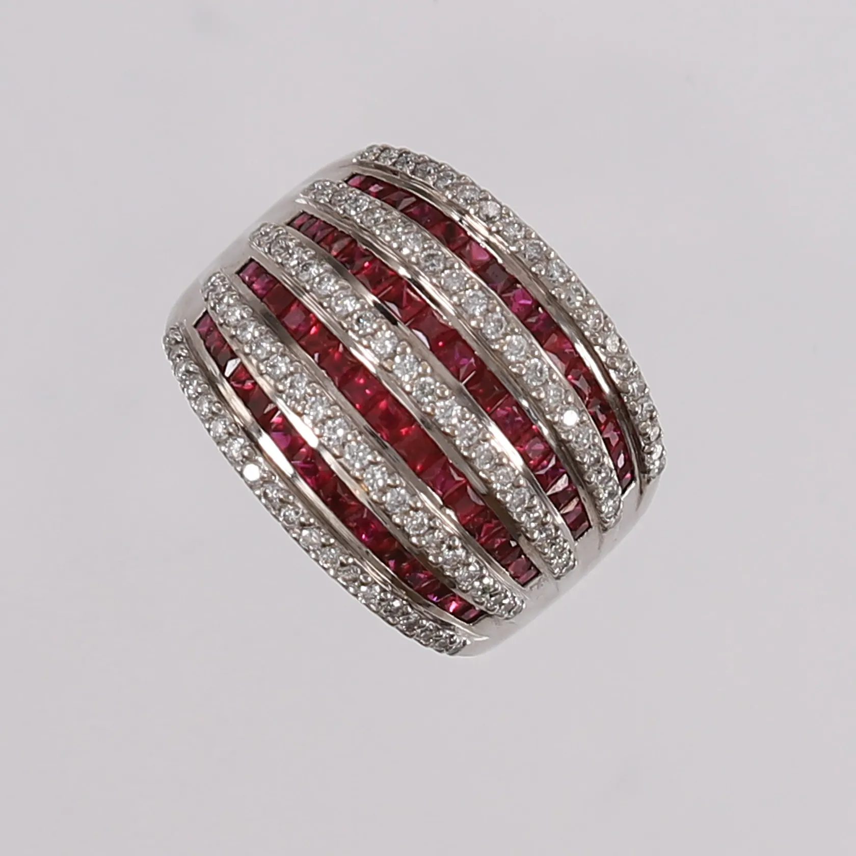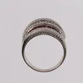 Ring med diamanter 95 x ca. 0,007ct og fiolette safirer, ø19,6mm, bredde 4,5- 17,8mm, hvitt gull, 18K. Vekt: 13,4 g. Kontakt Lånekontoret for frakt.