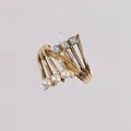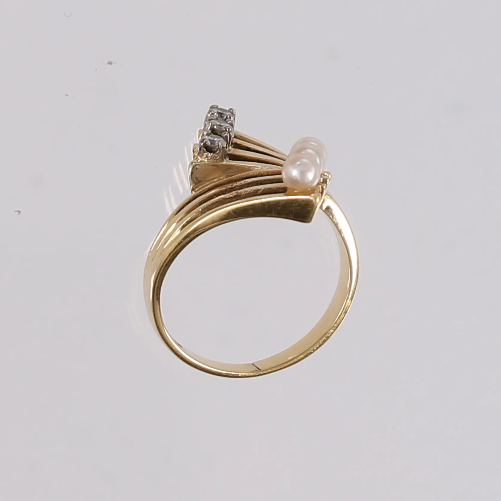 Ring med 3 perler og 3 blanke stener, ø16mm, bredde 2,2- 20,2mm, 14K, bruttovekt 4,6g Kontakt Lånekontoret for frakt.