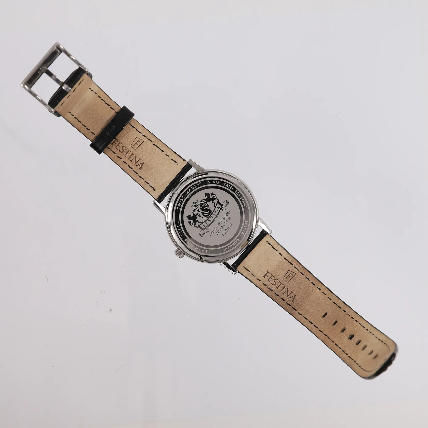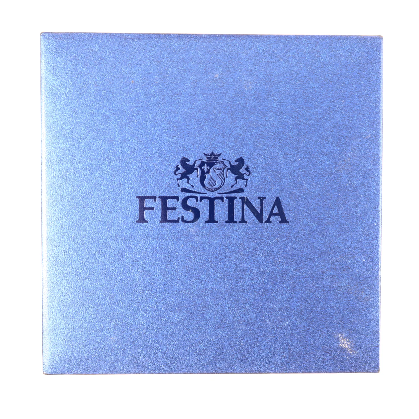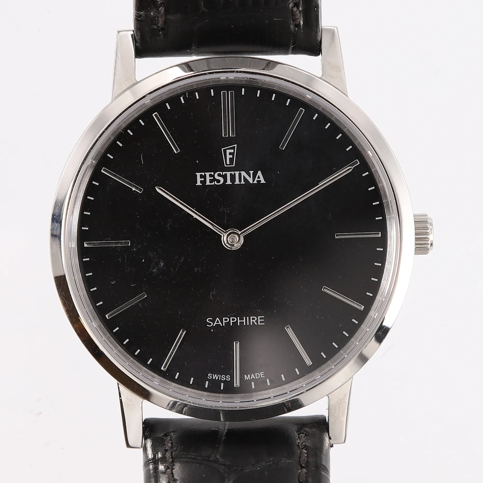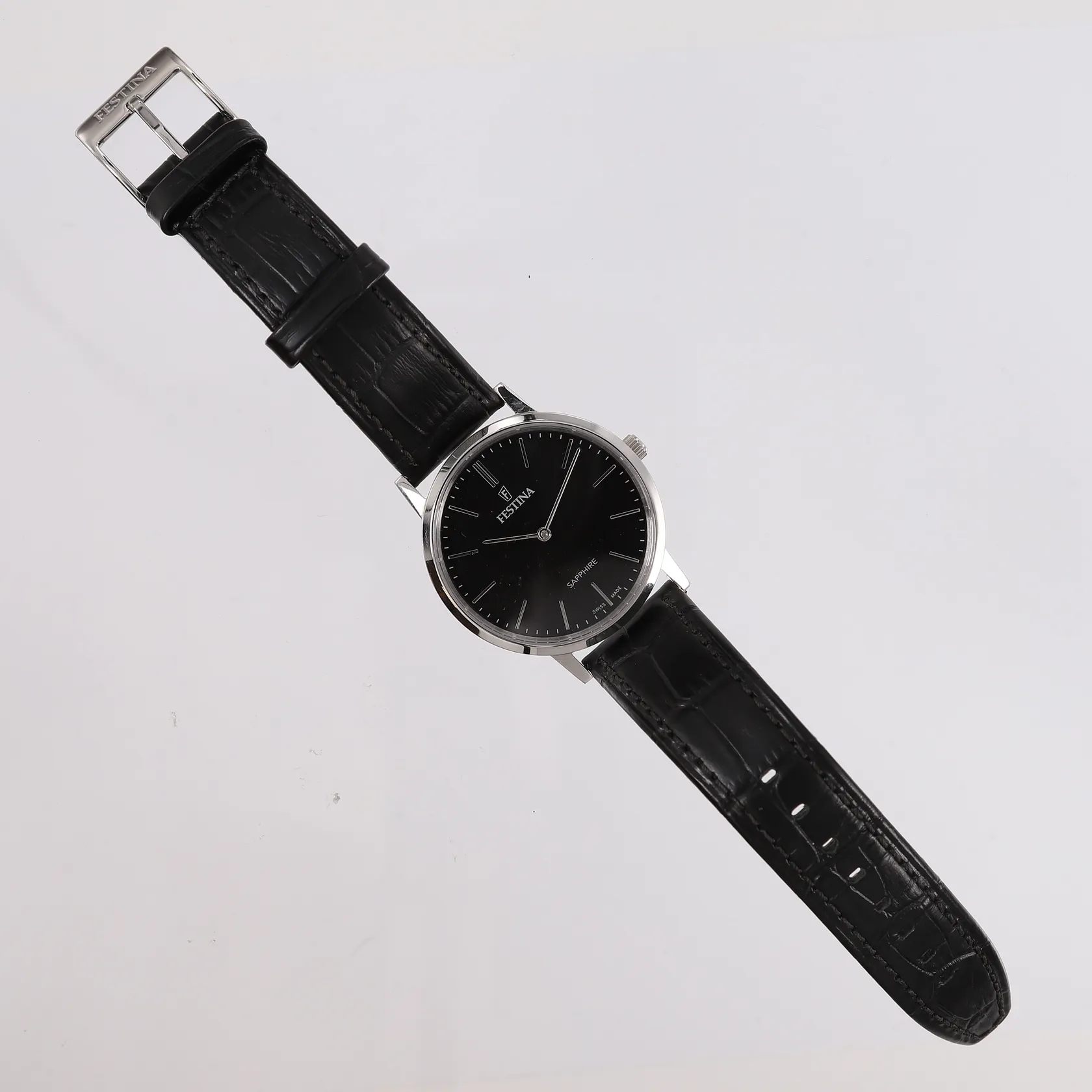 Festina, ref. F20012, stål, quartz, ø39mm, lær-rem, sort urskive, safirglass, trenger batteribyte, med boks og sertifikat år 2024. Kontakt Lånekontoret for frakt.