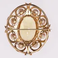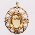 Brosje med perler og gul sten, lengde 5,5 cm, bredde 39 mm, 14K Vekt: 20,8 g. Kontakt Lånekontoret for frakt.